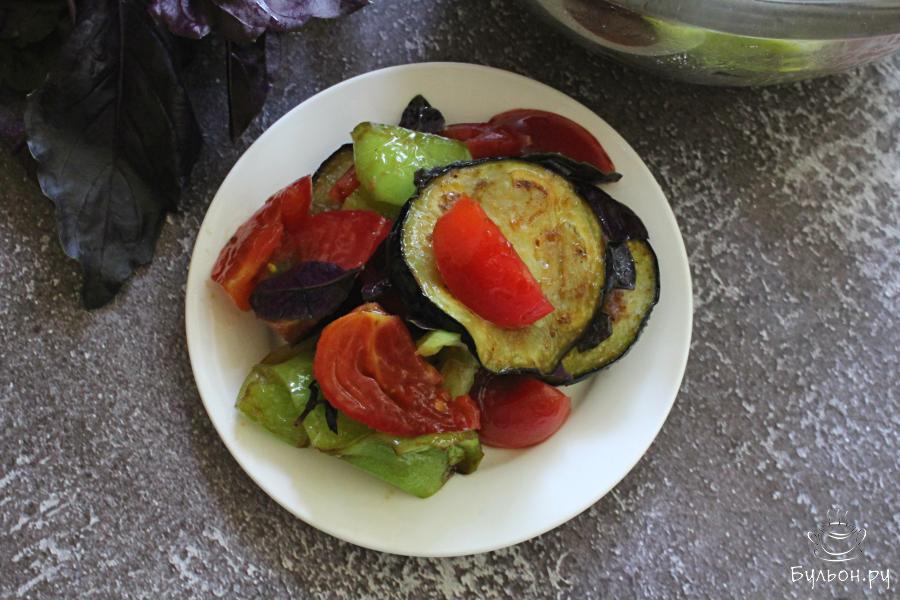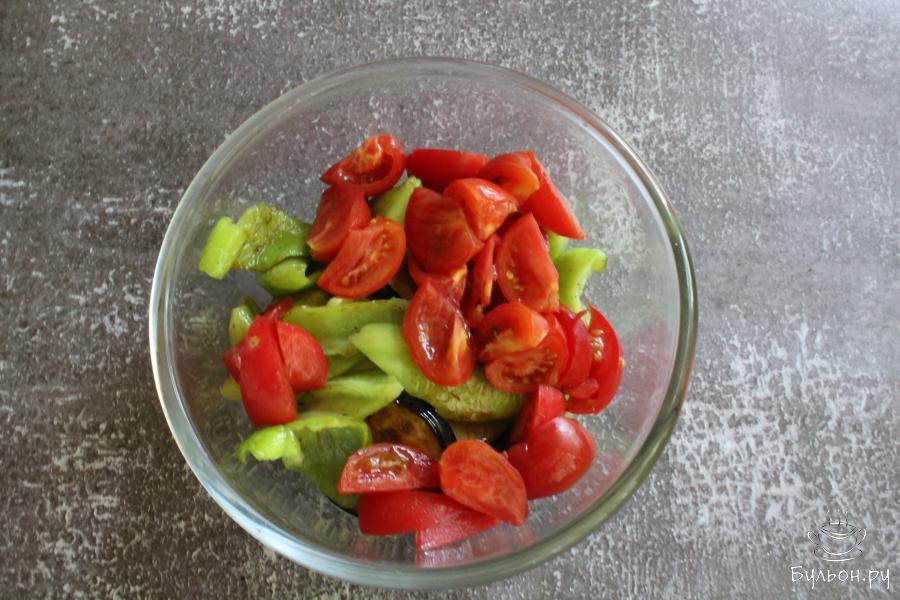 Для любителей сочетания баклажанов и помидоров, предлагаю обратить внимание на этот новый рецепт. Салат с жареными баклажанами, перцами и помидорами получается очень ароматный, сытный, насыщенный, сочный и вкусный. Готовится такой салат очень быстро и просто. Салат можно предложить, как на повседневный стол, так и для вегетарианского или постного меню. По желанию, в такой салат можно добавить лимонный сок, тоже будет очень вкусно.