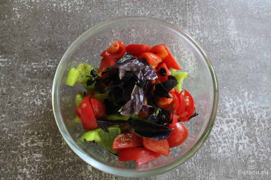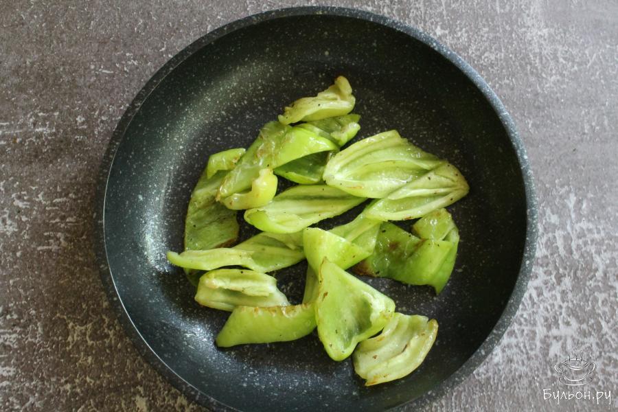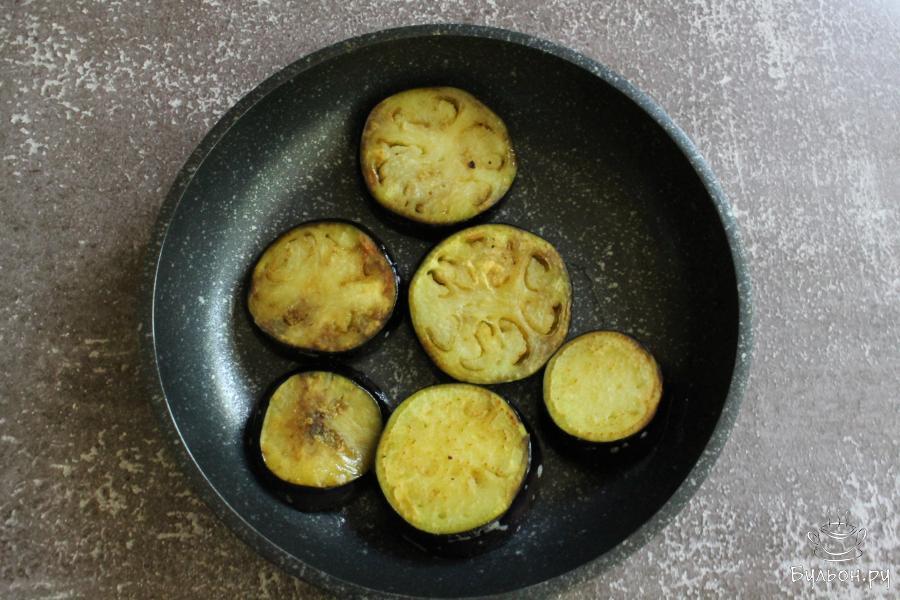 1. Овощи и зелень промыть, перцы почистить от семечек, все обсушить. Баклажаны нарезать толстенькими кружочками. На сковороде разогреть масло и обжарить баклажаны до румяного цвета, с двух сторон.