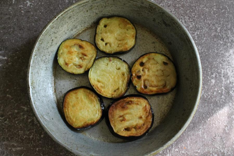 5. На сковороде разогреть оставшееся масло. Баклажаны нарезать не очень тонкими кружочками и обжарить их с двух сторон до румяного цвета.