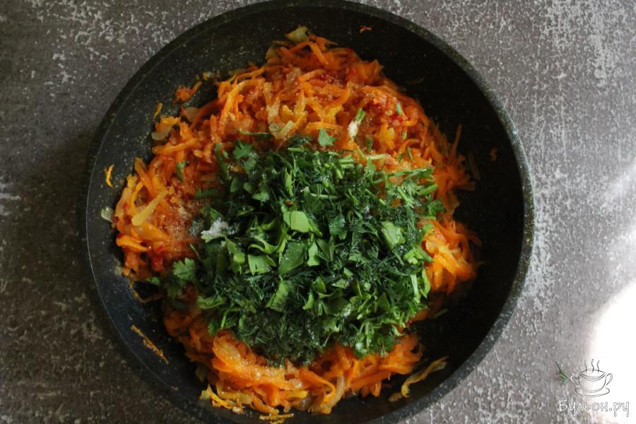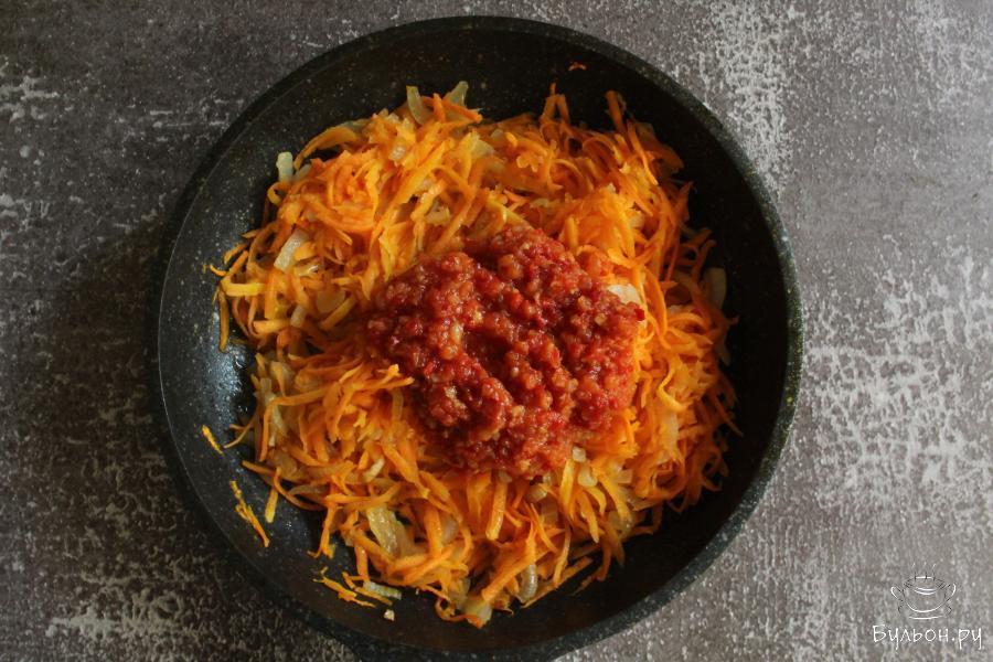 3. Помидоры перекрутить через мясорубку, добавить на сковороду, перемешать и тушить овощи 10-15 минут.