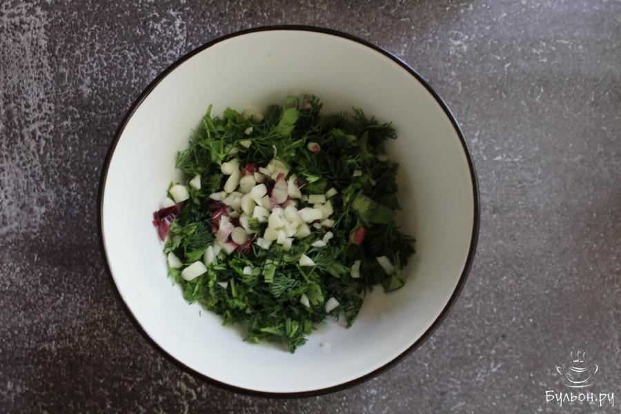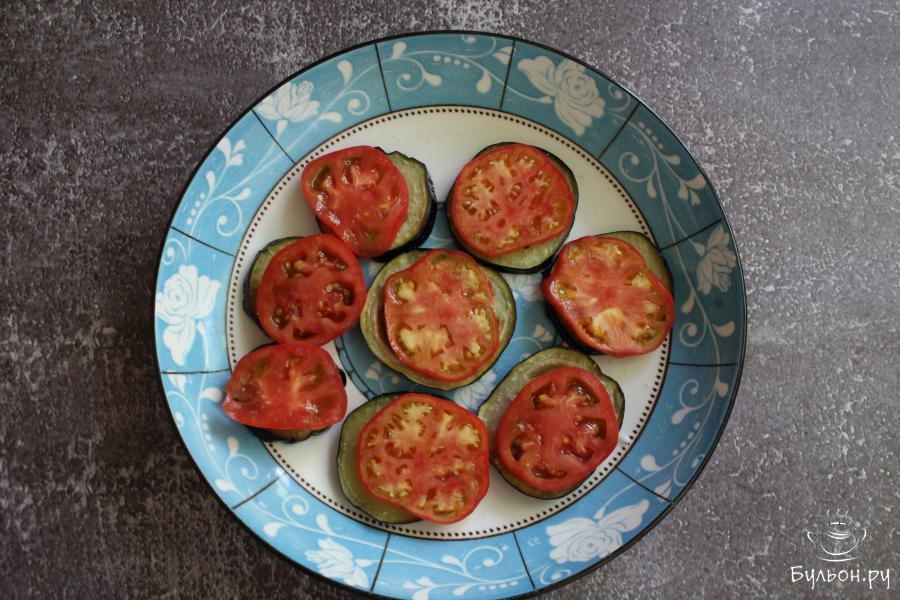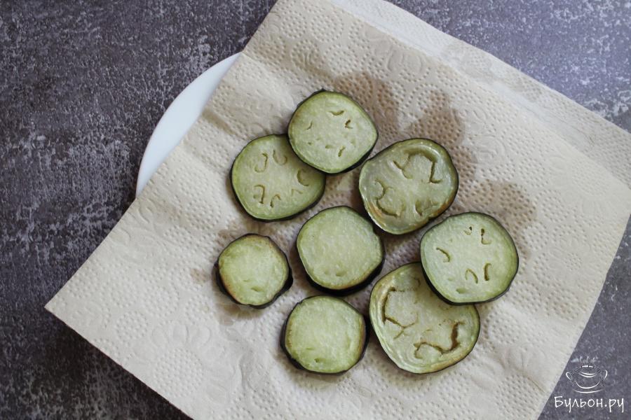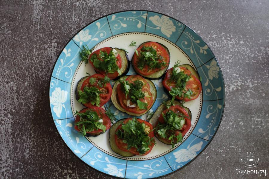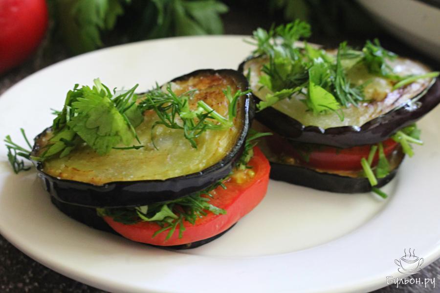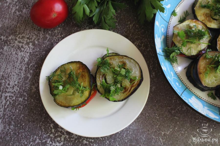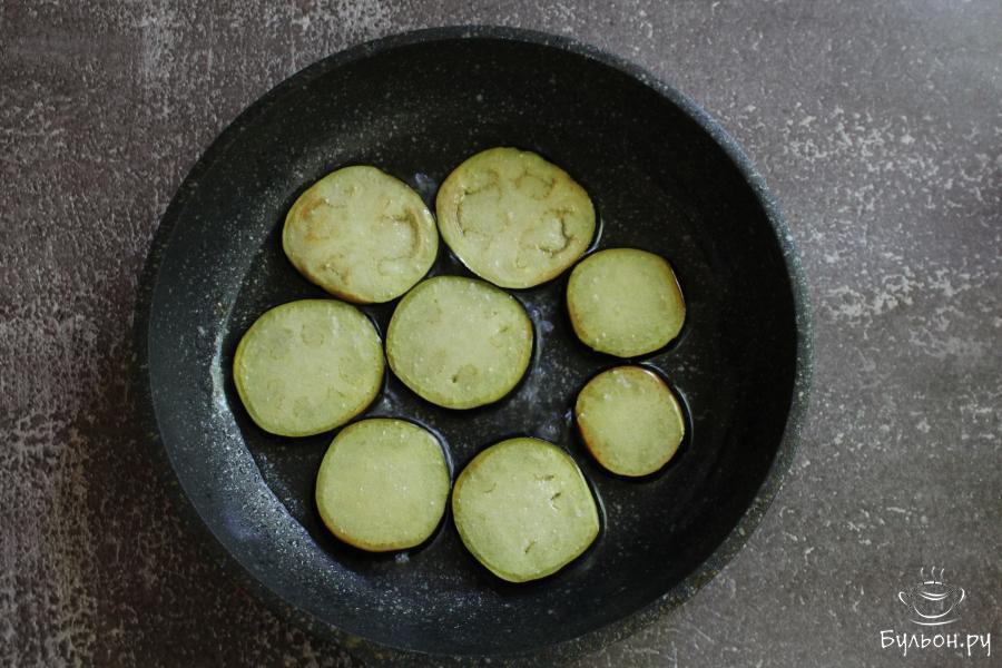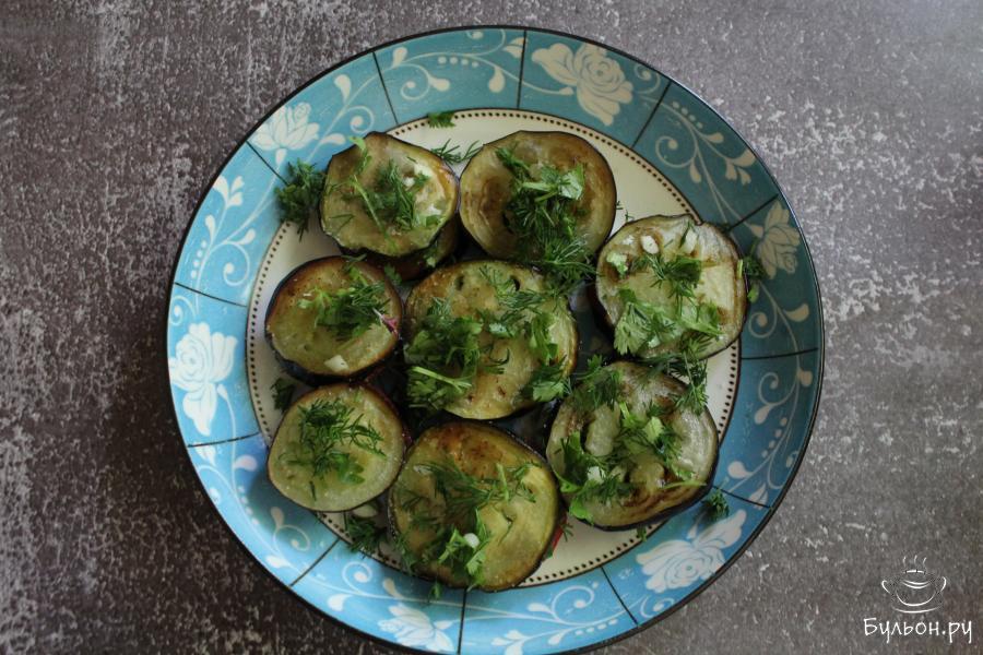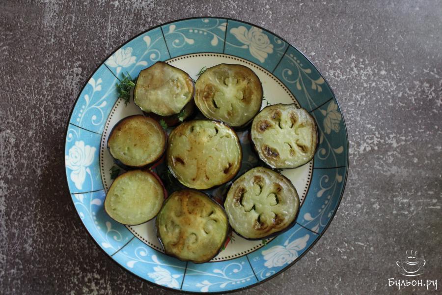 1. Овощи и зелень промыть, обязательно обсушить. Баклажаны нарезать не очень тонкими кружочками. На сковороде разогреть масло. Обжарить баклажаны по паре минут с каждой стороны.