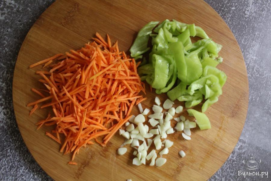 3. Овощи и чеснок почистить и промыть. Морковь натереть на терке для корейских салатов, перцы нарезать полосками, чеснок нарезать не очень мелко.