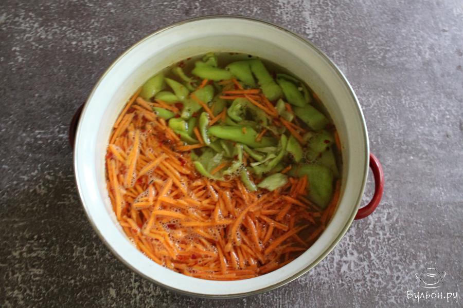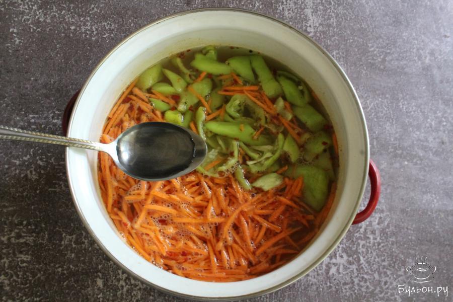 2. В кастрюлю выложить кориандр, соль, сахар и измельченный перец чили. Добавить воду, масло и довести рассол до кипения.