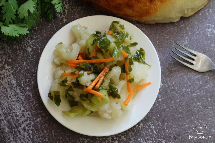 Маринованная цветная капуста с овощами по-корейски - понравится всем любителям пикантных и острых овощных закусок. Готовится капуста просто, но не очень быстро, ей надо время, чтобы она промариновалась. Закуска получается легкая, ароматная, душистая, бодрящая и очень сочная. По желанию, такую закуску можно сделать не острой и этот вариант тоже будет вкусный. Зелень можно разнообразить и добавить свою любимую. Закуска подойдет для постящихся и вегетарианцев.
