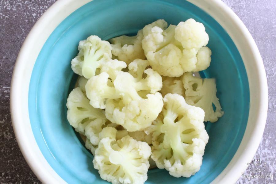 1. Капусту разобрать на соцветия, промыть и сварить в кипящей воде 5-7 минут. Откинуть капусту на дуршлаг.