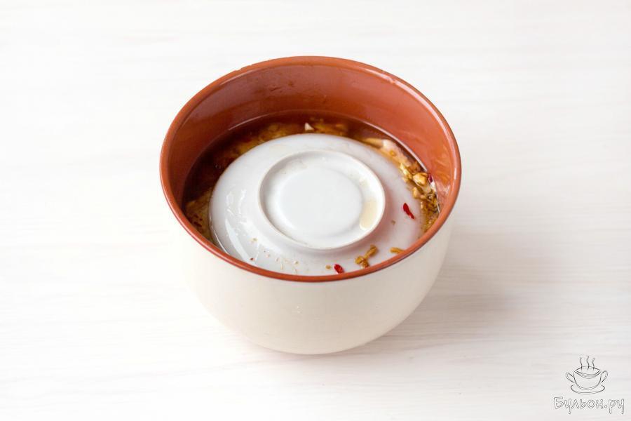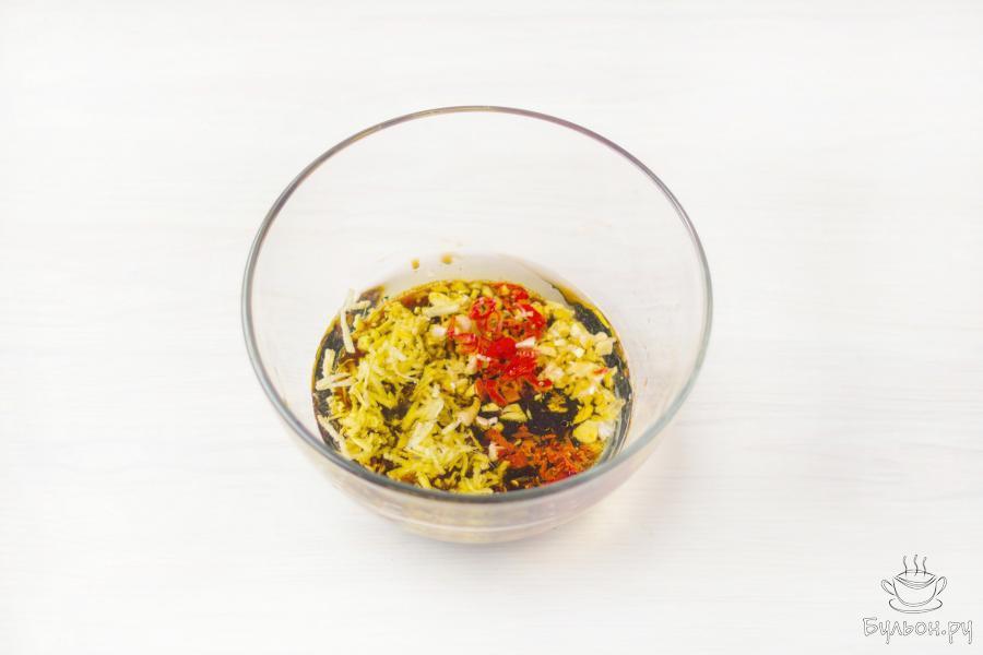 4. Соедините подготовленные компоненты маринада: смесь соевого соуса и масла, имбирь, чеснок и перец.