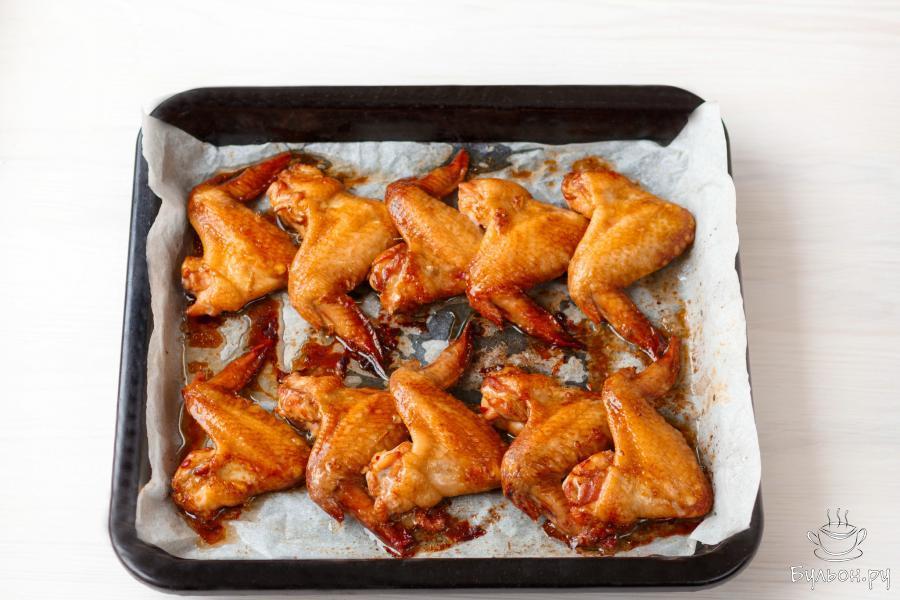 8. Подготовленные крылышки выложите в смазанную растительным маслом или выстеленную пекарской бумагой форму для запекания, в один слой.