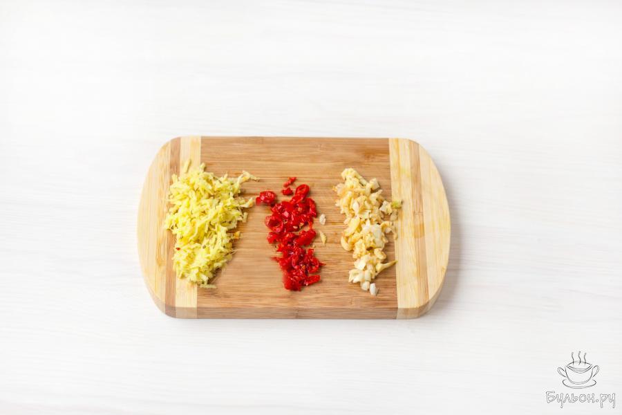 3. Натрите на терке 4-5 сантиметров очищенного корня имбиря. Мелко нарежьте зубчики чеснока и острый перец. Вместо свежего острого перца можно также использовать молотый красный перец, соус чили или острую аджику. Количество перца регулируйте по своему вкусу.