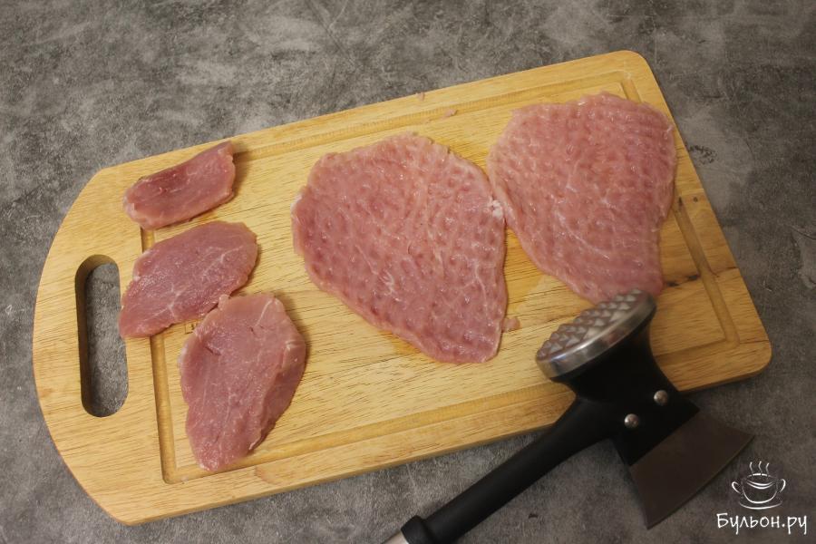 1. Промойте под водой свинину, нарежьте на стейки, обсушите их бумажными полотенцами. Слегка отбейте молоточком.