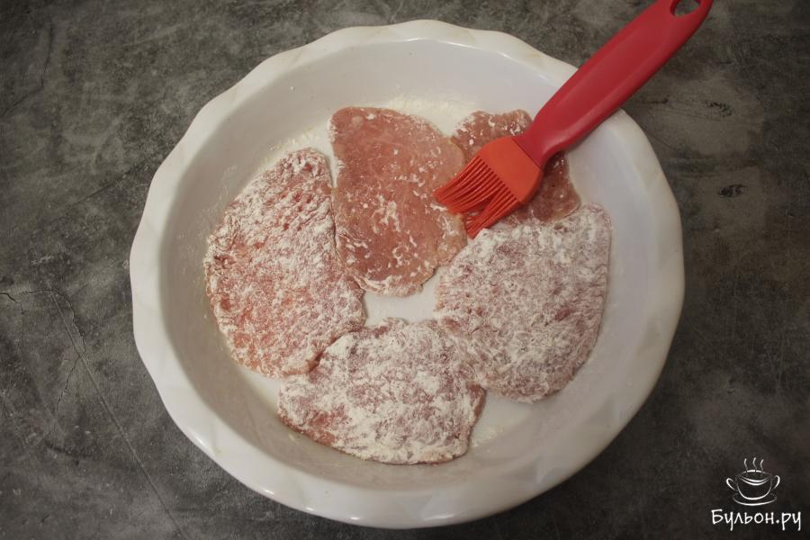 2. В миске смешайте пшеничную муку с солью. В этой муке обваляйте отбивные. Выложите отбивные в форму, смазанную слегка растительным маслом. Сверху, с помощью кондитерской кисточки, также слегка смажьте мясо растительным маслом.
