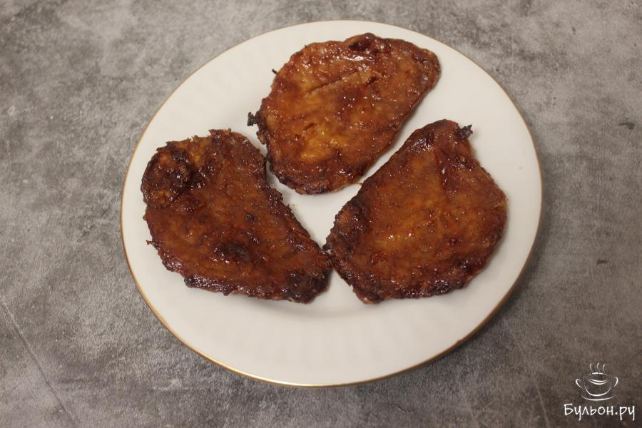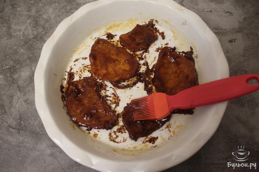 4. Соус барбекю смешайте с медом. Подрумянившиеся свиные отбивные сверху смажьте приготовленным соусом и выпекайте в духовке еще 7 минут, снизив температуру духовки до 180 градусов.