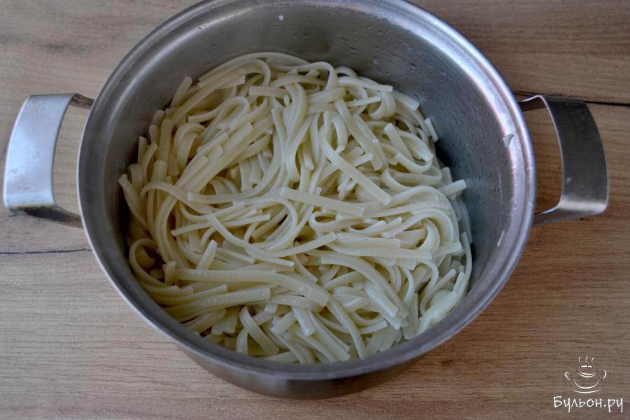 1. Сварите макароны в подсоленной воде, согласно инструкции на упаковке. С готовых макарон слейте воду.