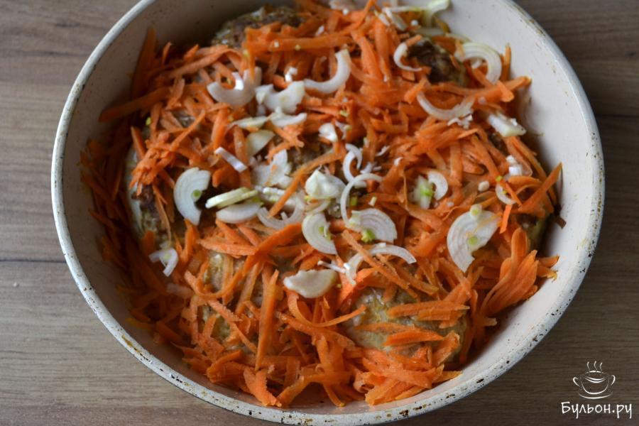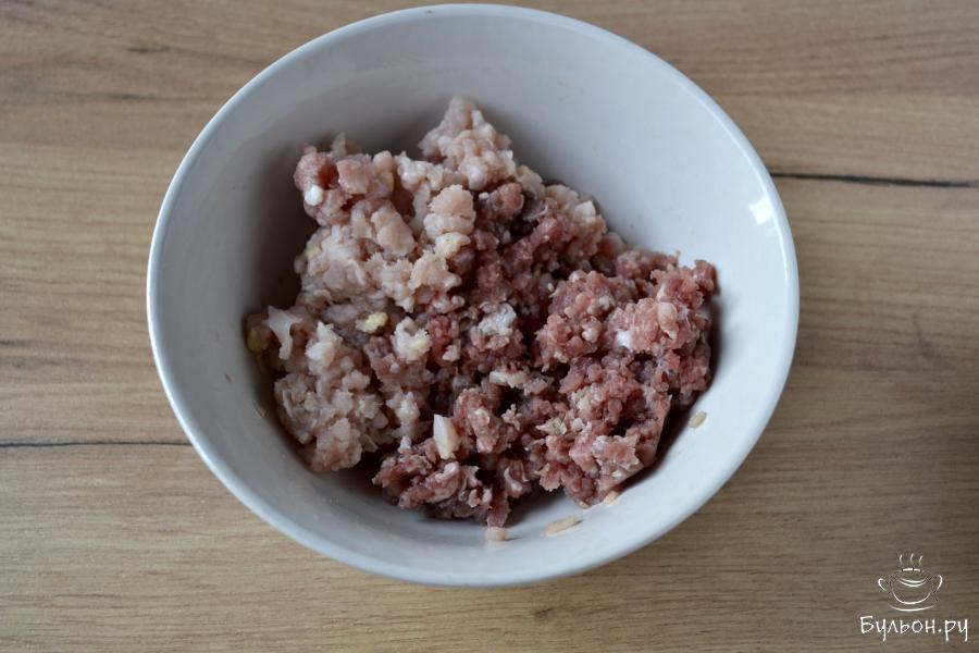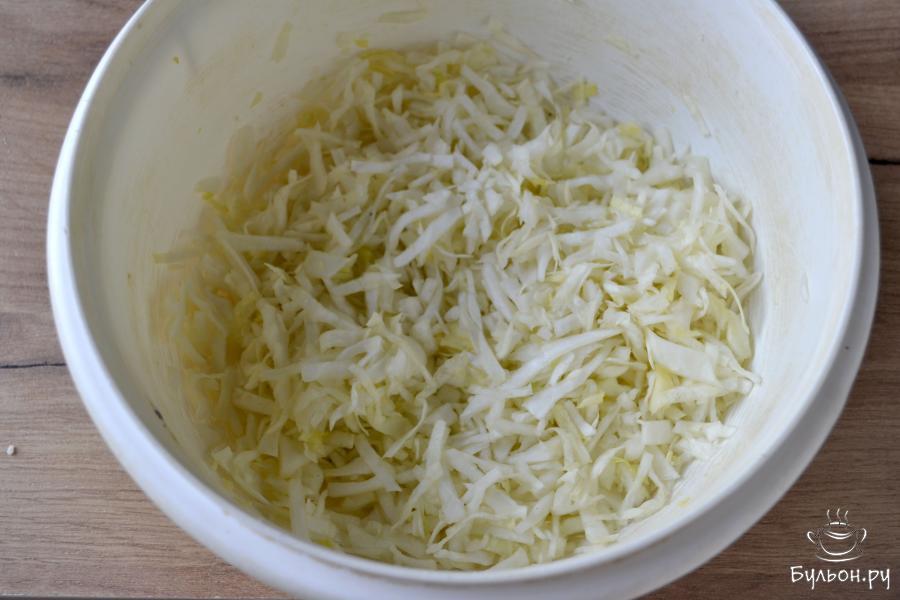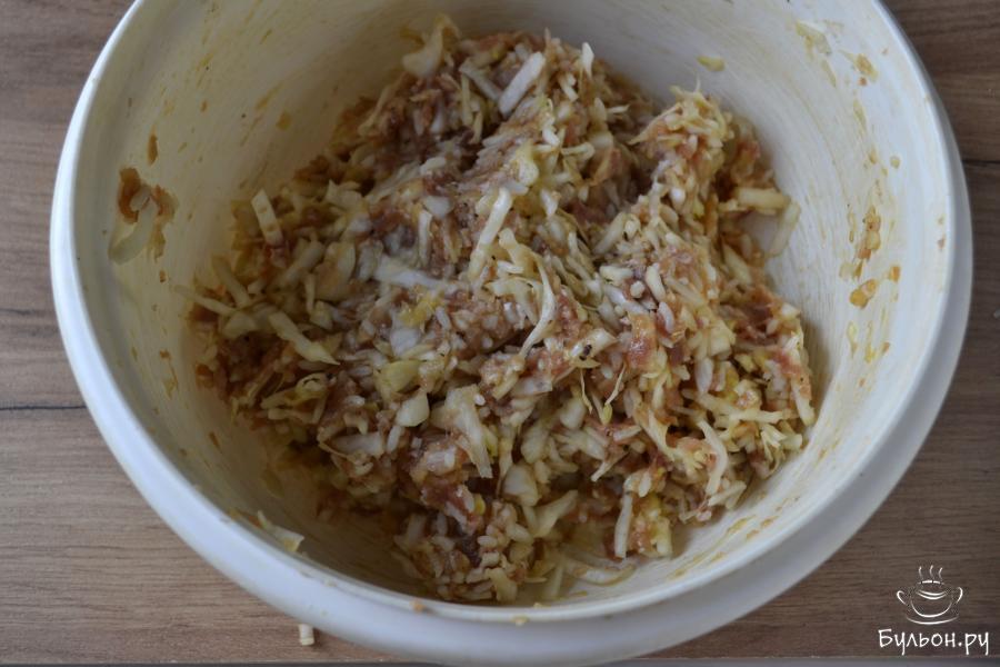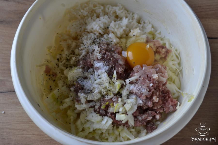 4. В миску с капустой положите мясной фарш, разбейте яйцо, посолите и поперчите, добавьте мелко нарезанный репчатый лук.