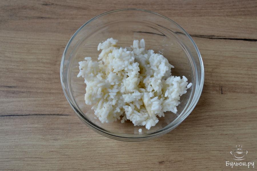 2. Промойте рис до чистой воды. Положите крупу в кастрюлю, влейте воду (300 мл.), сварите до полного впитывания воды. Во время варки рис посолите.
