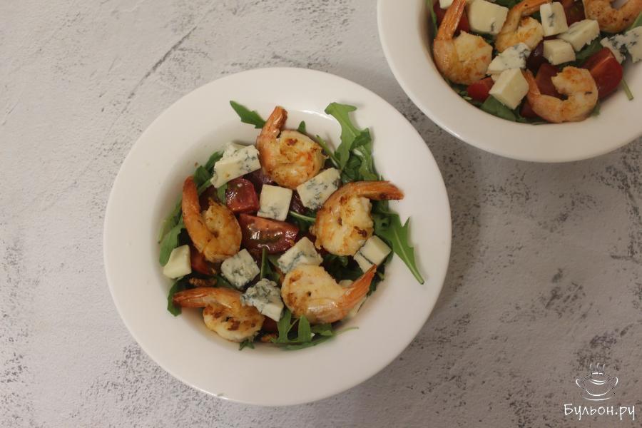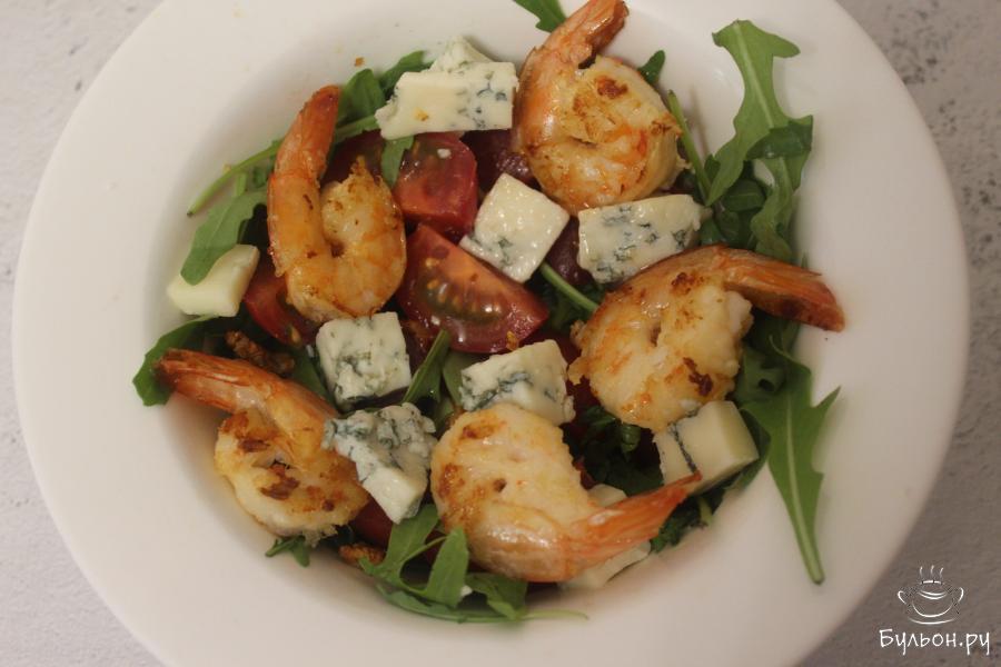 3. На тарелку выложите вымытую и обсушенную рукколу. Поверх выложите обжаренные креветки, нарезанные на половинки или четвертинки помидоры черри и кубики сыра.