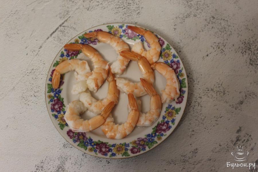 1. Замороженные креветки залейте горячей водой. Через 2 минуты слейте воду. Немного остудите креветки, удалите головы, очистите от панцирей, я хвостики оставила, но вы и их можете удалить.
