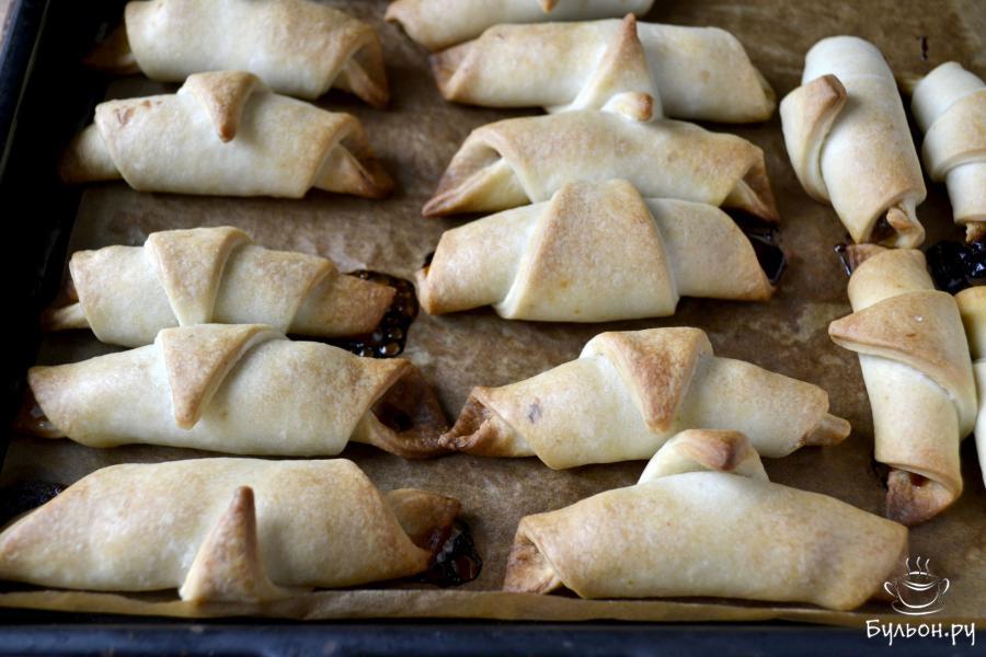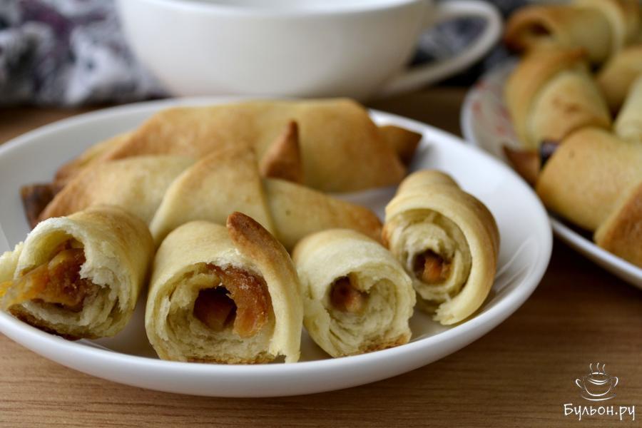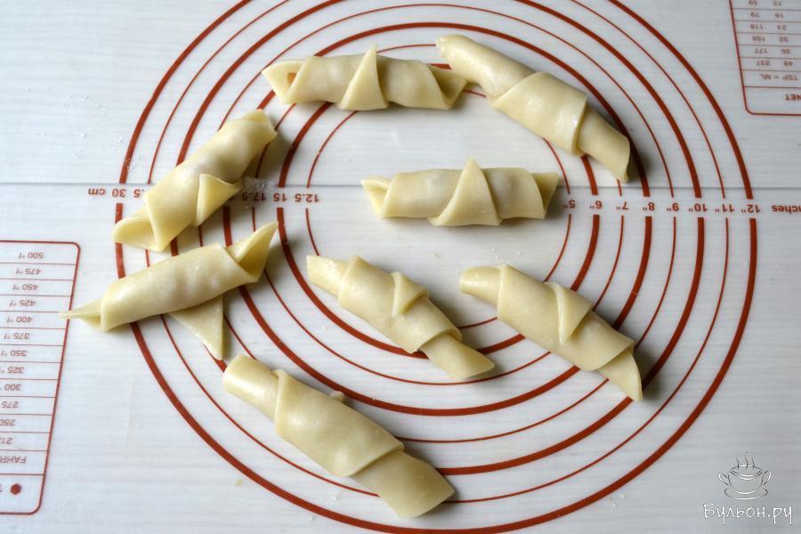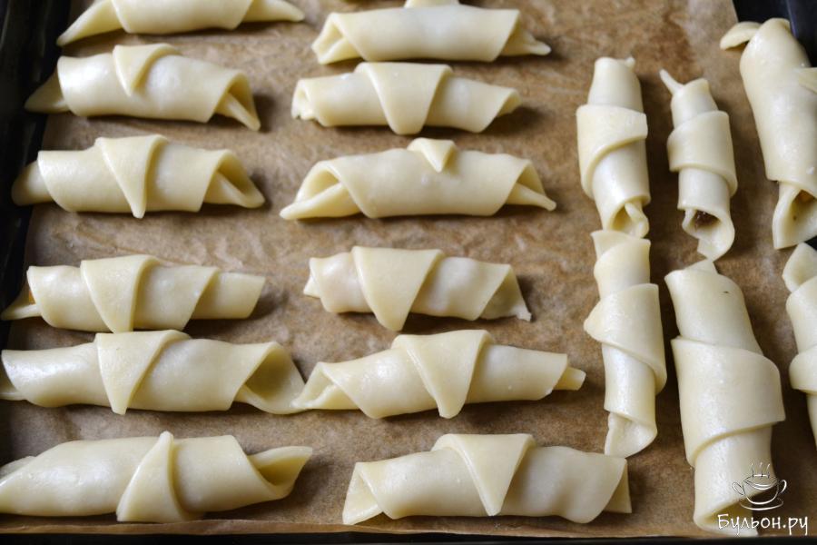 6. Начиная с широкого края сверните треугольник в рулетик. Приготовьте такие же рулетики из остального теста.