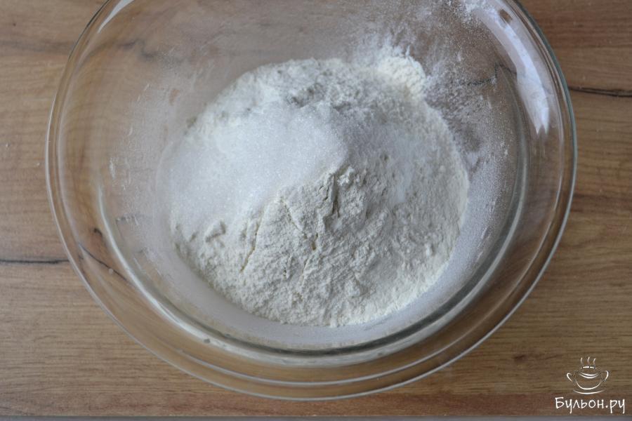 5. Разделите тесто, для удоства раскатывния, на две части. Первую часть раскатайте в круг, разрежьте на 8 частей. Положите на широкий край треугольника начинку. Для начинки используем курагу, нарезанную на кусочки и сахар.