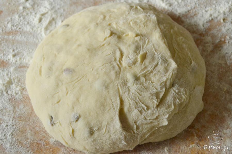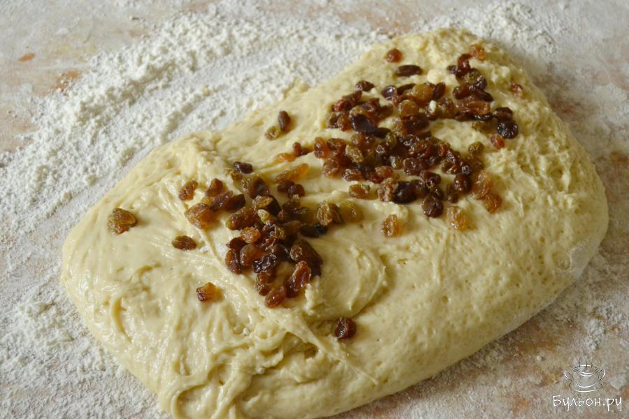 5. Созревшее тесто для пасхи выложить на стол, присыпанный мукой. Добавить изюм и вымесить тесто. Муки на подсып может понадобиться больше.