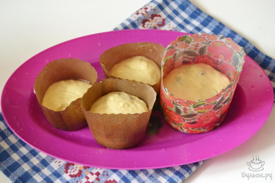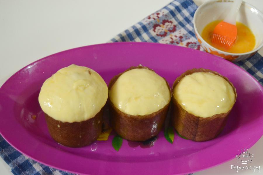 8. Оставим на некоторое время для расстойки. Когда тесто поднимется, смажем куличики желтком и поставим выпекаться. Температура выпечки зависит от духовки, высокую выставлять не нужно.