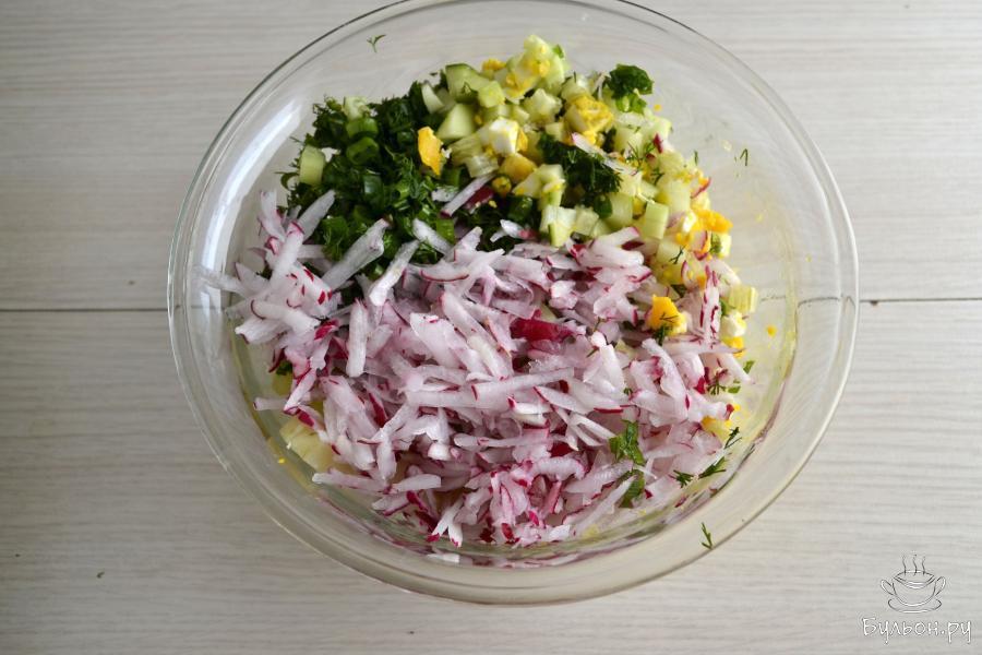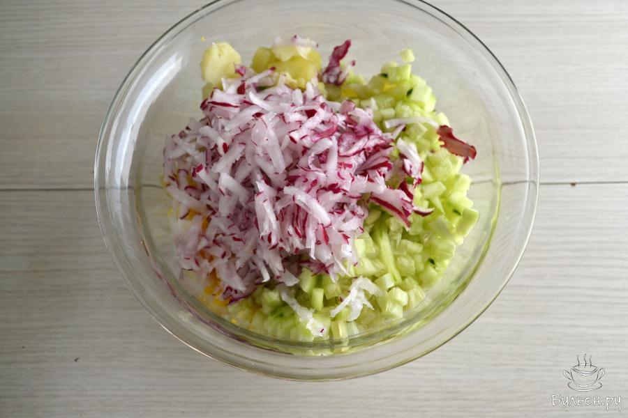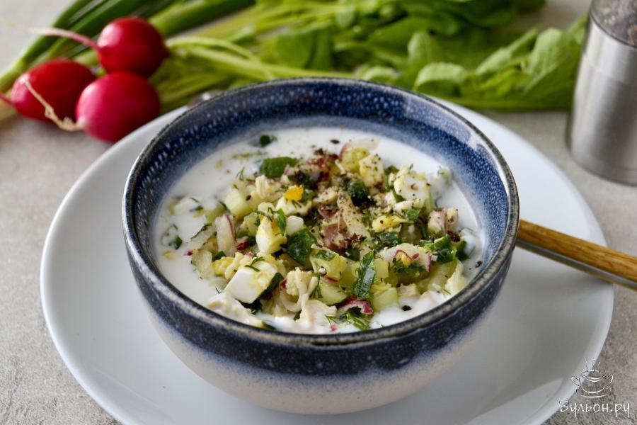 6. Положите порцию салата в тарелку, влейте кефир, посыпьте черным молотым перцем и подавайте к столу. Приятного аппетита!