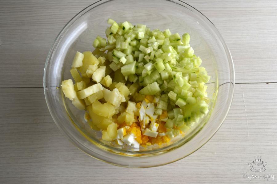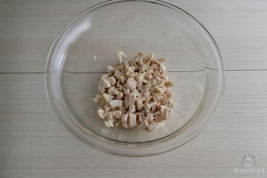 1. Сварите куриную грудку в подсоленной воде в течение получаса. Выньте ее из бульона, полностью охладите. Нарежьте поперек волокон на кусочки.