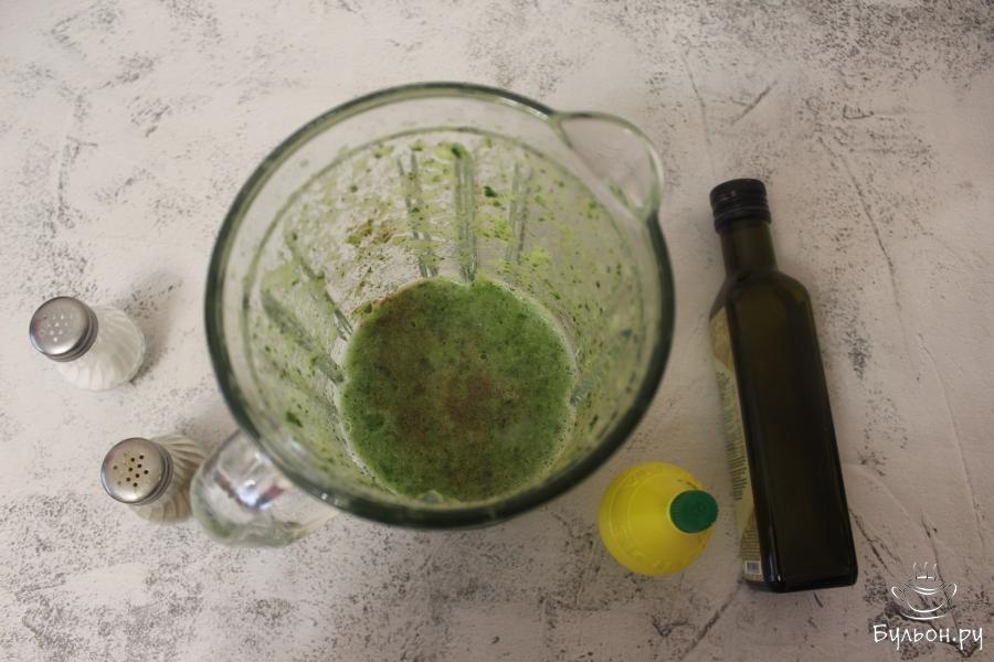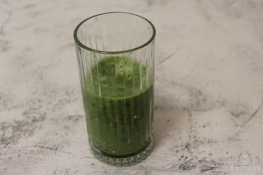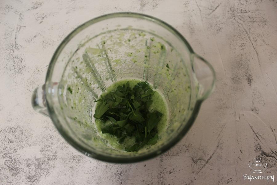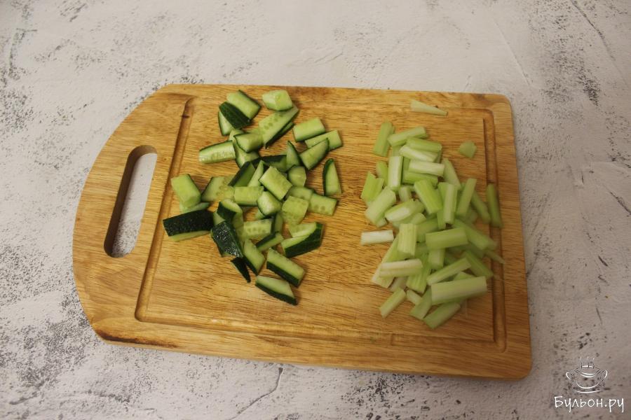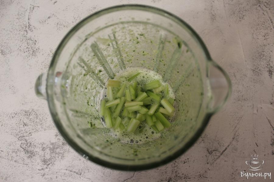2. Пробейте в бленедере сначала огурец с водой. Затем добавьте в чашу блендера сельдерей и снова пробейте.