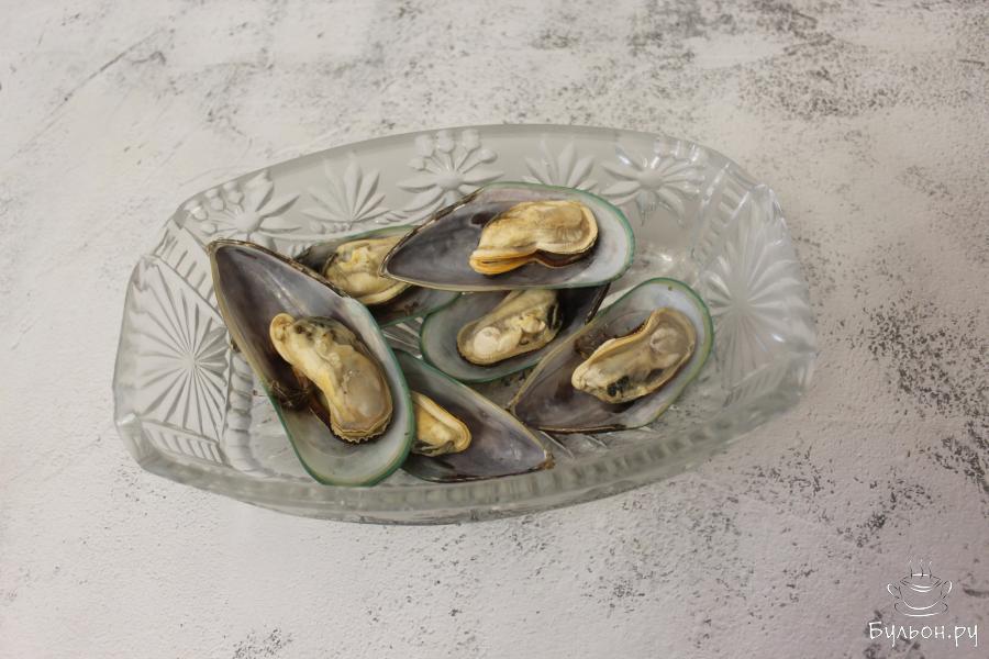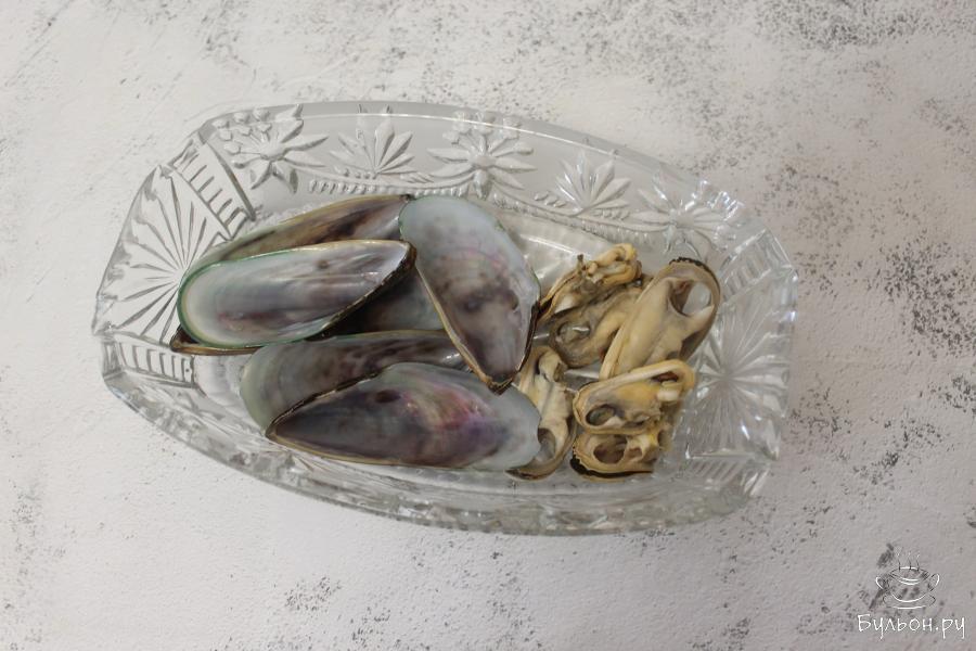 2. Когда мидии будут разморожены, аккуратно отделите мясо от створок, удалите желудочки и мышцы мидий, а сами раковины тщательно промойте.