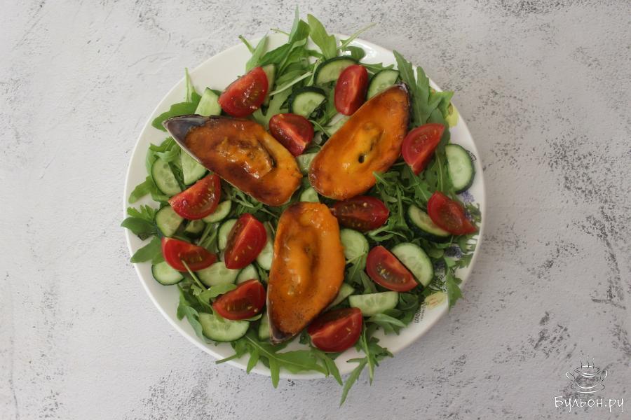 Что может быть полезнее свежих овощей и морепродуктов. Этот овощной салат с запеченными мидиями - кладезь витаминов и полезных веществ. Заправку для этого салата готовить не надо, поскольку соуса спайси, с которым запекаются большие мидии, будет вполне достаточно. Сам соус придаст этому салату определенную остринку. Мидии, конечно, берите "киви". Они большие, вкусные и очень красивые, с зеленой раковиной.