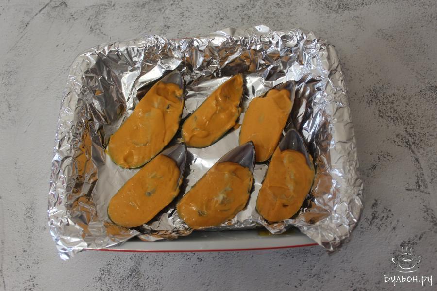 3. Подготовленное мясо мидий выложите обратно в створки, сверху выложите спайси соус. Форму для запекания застелите фольгой и расположите на фольге подготовленные мидии. Запекайте мидии в разогретой до 200 градусов духовке в течение 15-20 минут.