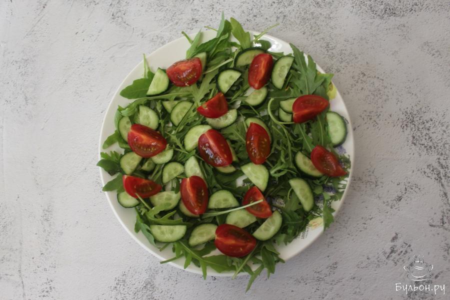 4. На тарелку выложить рукколу, поверх выложить половинки огурцов и половинки или четвертинки помидоров черри.