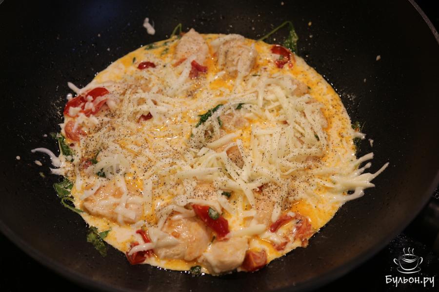 5. Влейте сливки, добавьте натертую в на крупной терке моцареллу, посолите, поперчите. Периодически помешивая, готовьте блюдо еще 4-5 минут.