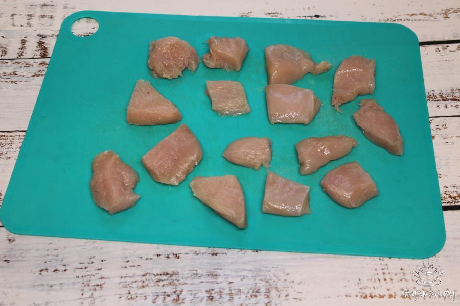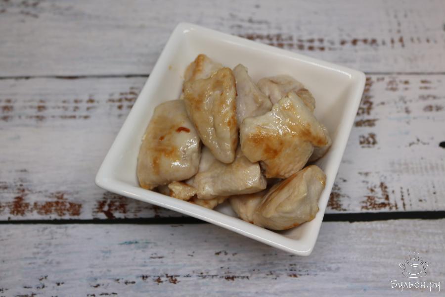 1. На сковороду влейте оливковое масло, разогрейте его и выложите кусочки куриного филе, посолите их.