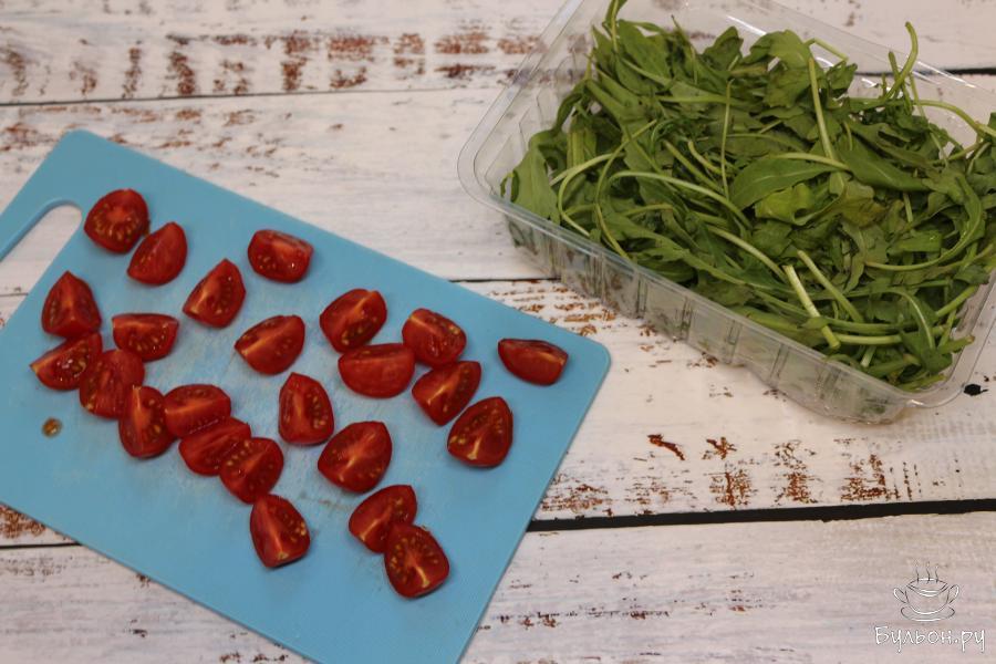 3. Теперь в эту же сковороду положите, разрезанные на четвертинки, помидоры черри и листья рукколы. Помидоры слегка раздавите лопаткой и жарьте все вместе 2-3 минуты.