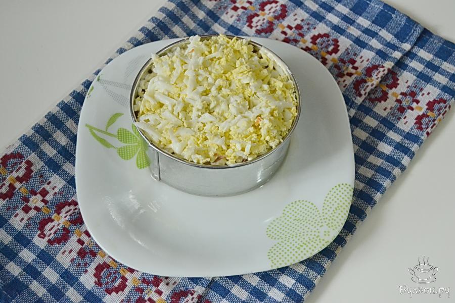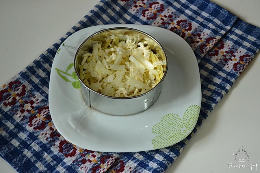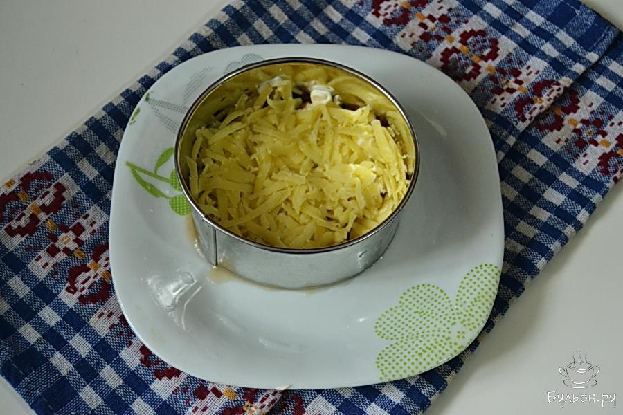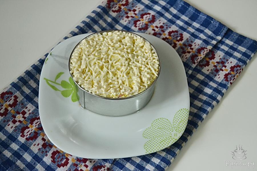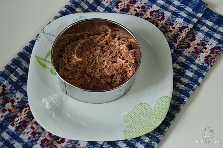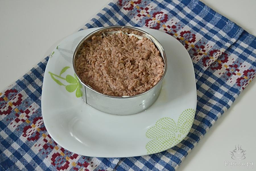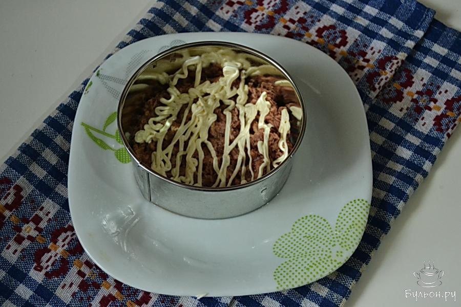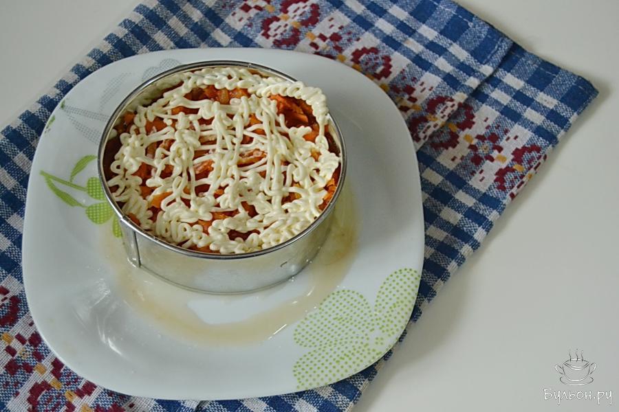 10. И снова - майонезная сеточка. Наш слоеный салат из тунца готов. Поставим ненадолго в холодильник, затем снимем гарнирное кольцо (если вы им пользовались).