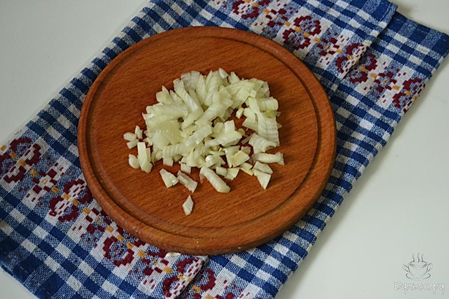 4. Меленько нарубить репчатый лучок. Очень хорошо, если есть лук фиолетовый или белый салатный. Эти сорта мягче.