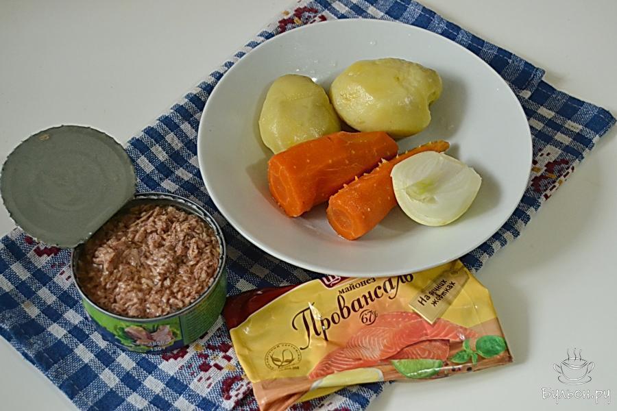 Если у вас имеется в запасе баночка консервированного тунца, можно приготовить из нее салат. Делать этот салат мы будем слоеным, располагая ингредиенты слоями и смазывая каждый слой майонезом. А ингредиенты нам понадобятся доступные и привычные - отварная картошка, отварная морковка, сваренные вкрутую яички. Если вы решите поменять слои местами - это вполне допустимо, также можно убрать какой-либо слой или же заменить его другим.