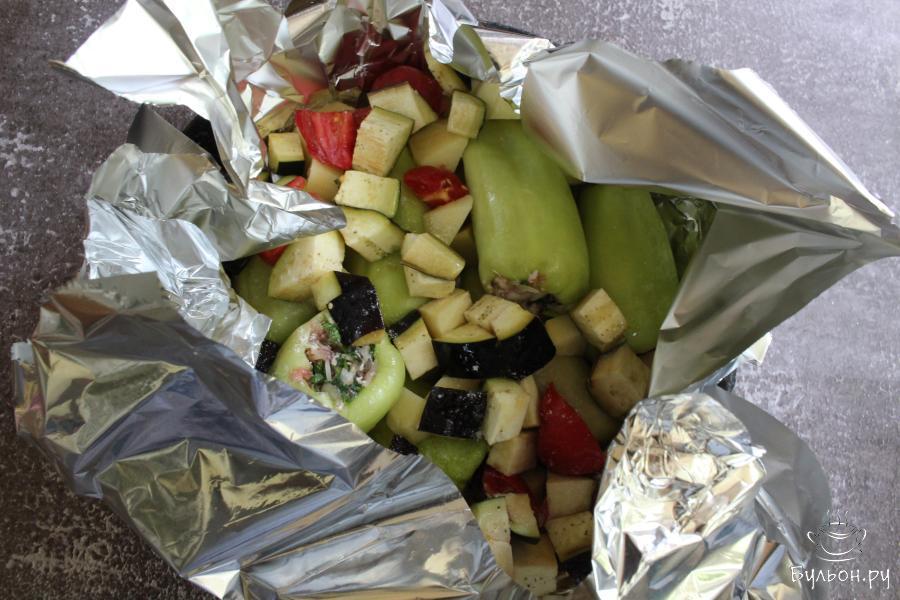 5. Баклажаны и помидоры промыть, нарезать кубиками и выложить к перцам. Из фольги сформировать чашку, влить масло и воду, посолить. Фольгу полностью закрыть.