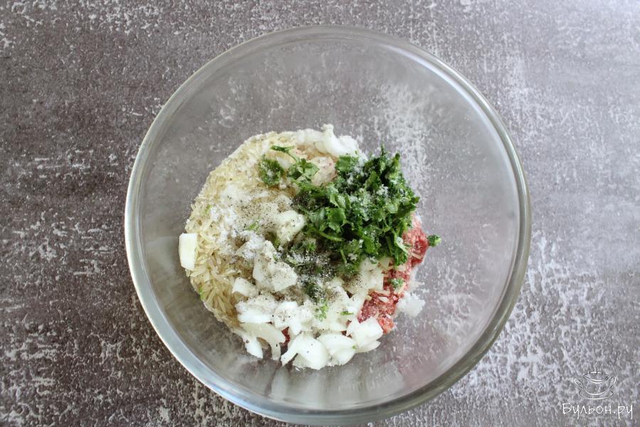 3. Зелень мелко нарезать и добавить в чашку. Фарш посолить, поперчить, добавить 50 мл. воды и хорошо перемешать.