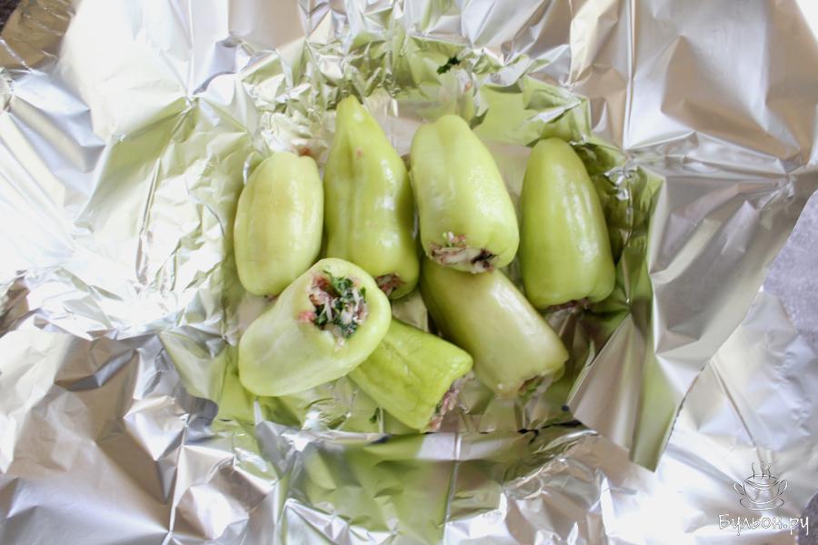 4. Перцы почистить, промыть и наполнить фаршем. Фольгу выложить в форму да запекания или на противень, на фольгу выложить перцы.