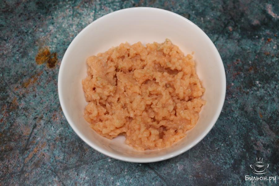 2. Лук натрите на мелкой терке. Добавьте к рыбному фаршу лук, соль и черный молотый перец, все хорошо перемешайте.