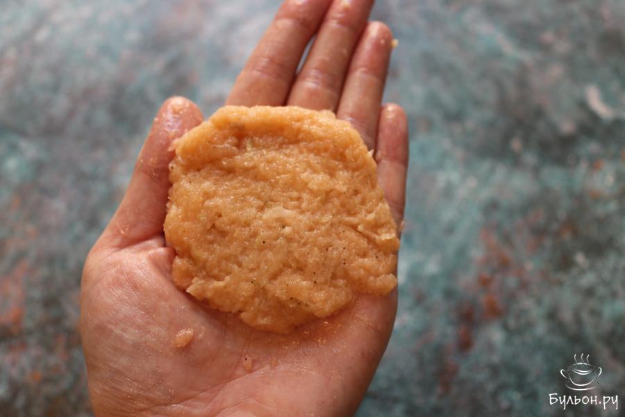 3. Разделите весь фарш на 6 частей, сформируйте шарики, затем прижмите их рукой, сформировав маленькие, не толстые, круглые котлетки.