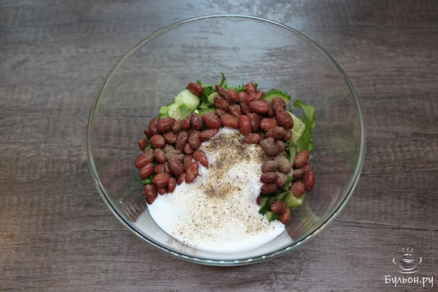 4. Красную фасоль выложите в дуршлаг. Промойте ее и оставьте, чтобы стекла вода. Уже высушенную фасоль переложите в салатник, добавьте натуральный йогурт, посолите, поперчите.
