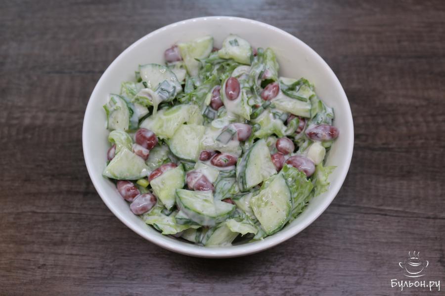 Предлагаю вашему вниманию еще один рецептик летнего салата, а именно свежий салат с фасолью. Салат готовится за считанные минуты, он очень прост, но при этом содержит много ингредиентов, для разнообразия придется очень кстати. Салат получается полезным, питательным, но недостаточно сытным. Поэтому советую к салату подать рыбу, птицу или мясо. Салатик легкий, хрустящий, нежный за счет йогурта, с легкой перчинкой, что добавляет ему пикантности.