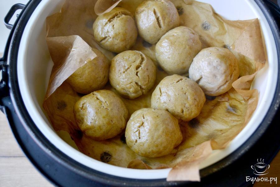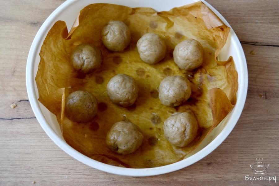 9. В поддон мультиварки для приготовления на пару положите пекарскую бумагу, которую наколите в нескольких местах. Разделите тесто на равные по весу кусочки. Скатайте из них шарики, уложите на пергамент в поддон.