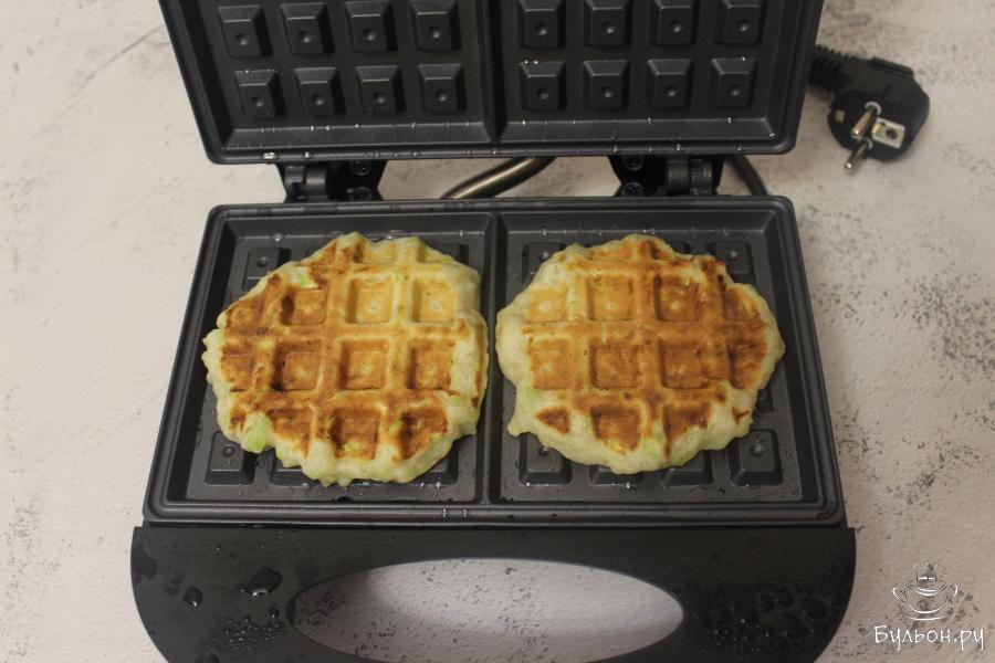 4. Панели вафельницы смажьте растительным маслом и хорошенько разогрейте. Выложите по 1 столовой ложке теста для каждой вафли. Выпекайте вафли в течение 3-5 минут.
