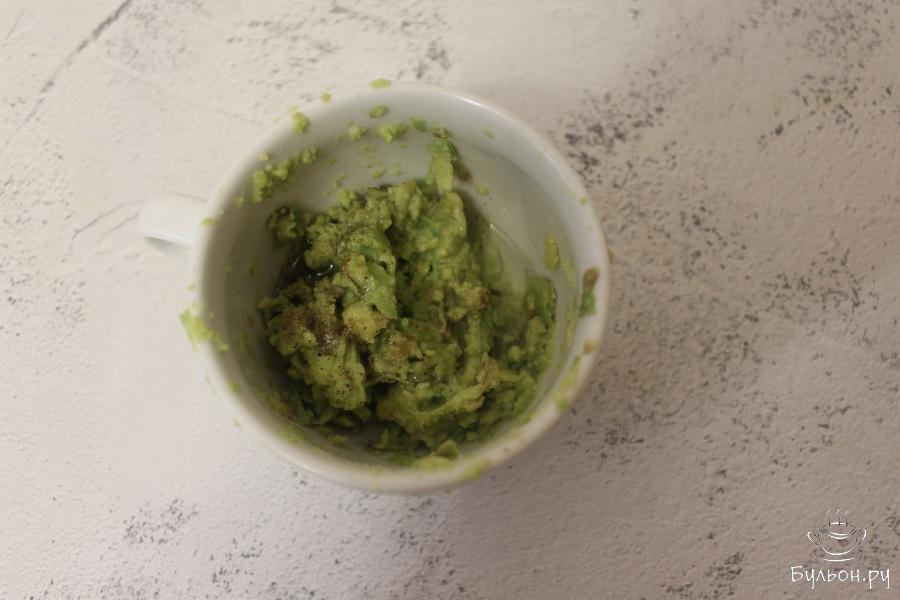 1. Разрежьте плод авокадо и удалите косточку. При помощи ложки достаньте мякоть половинки авокадо. Мякоть авокадо разомните вилкой, добавьте лимонный сок, оливковое масло, поперчите, посолите и перемешайте.