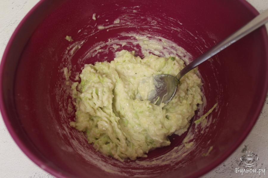 3. Очистите кабачок, натрете его на средней терке, отожмите лишний сок и переложите в миску. Вбейте яйцо, подсолите и перемешайте. Затем всыпьте рисовую муку и разрыхлитель, перемешайте.