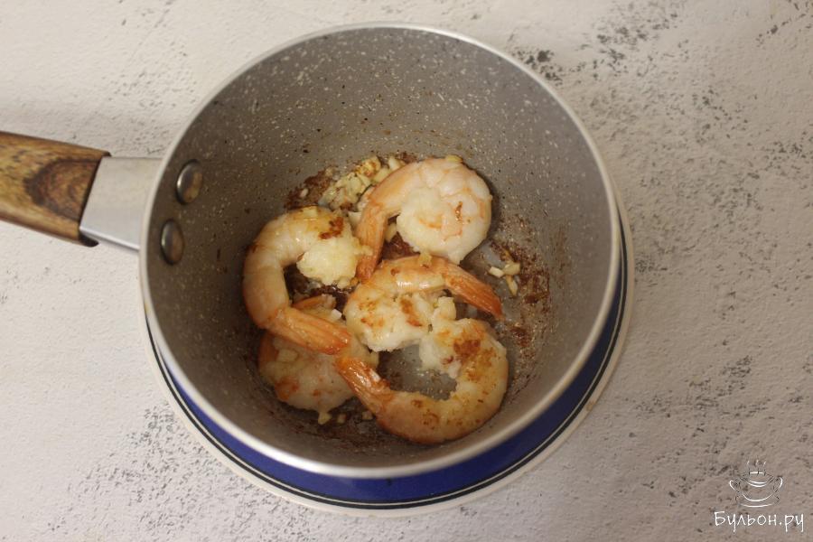 2. Размороженные креветки очистите. В сковороду выложите кусочек сливочного масла, растопите его. Выложите креветки, обжаривайте их на среднем огне, постоянно помешивая, в течение 2 минут. Добавьте в сковороду измельченный чеснок. Перемешайте и готовьте еще пару минут.