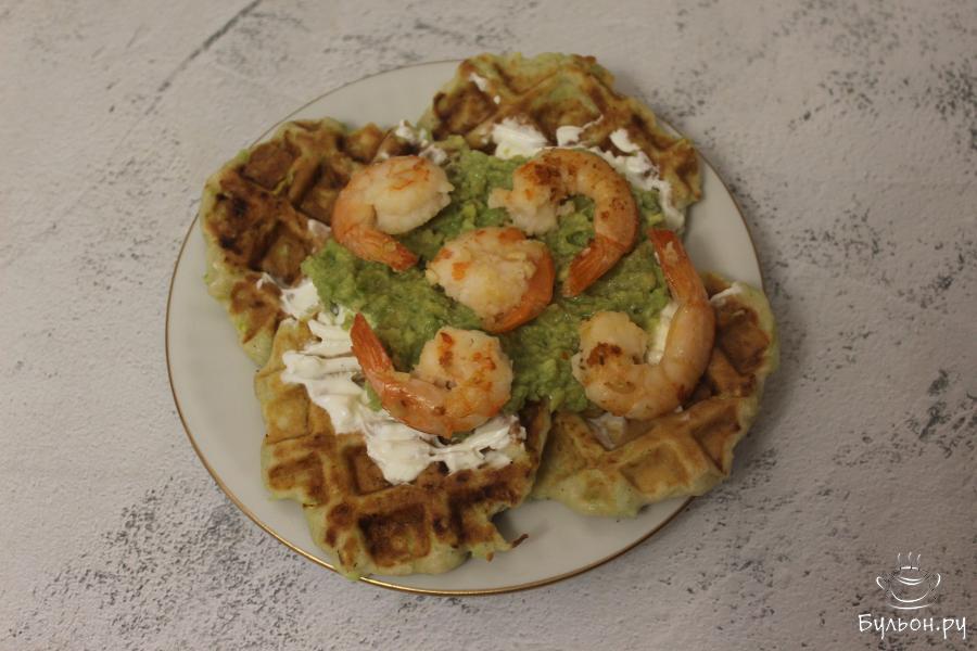5. Вафли выложите на тарелку, поверх вафель выложите творожный сыр, сверху пасту из авокадо и креветки.